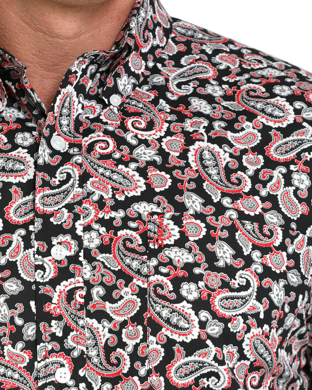 This black paisley button down engineered by CINCH offers a timeless look in a Modern Fit design for a tailored profile. Comfortable cotton plain weave construction features an open left front pocket with embroidered logo, and white buttons.