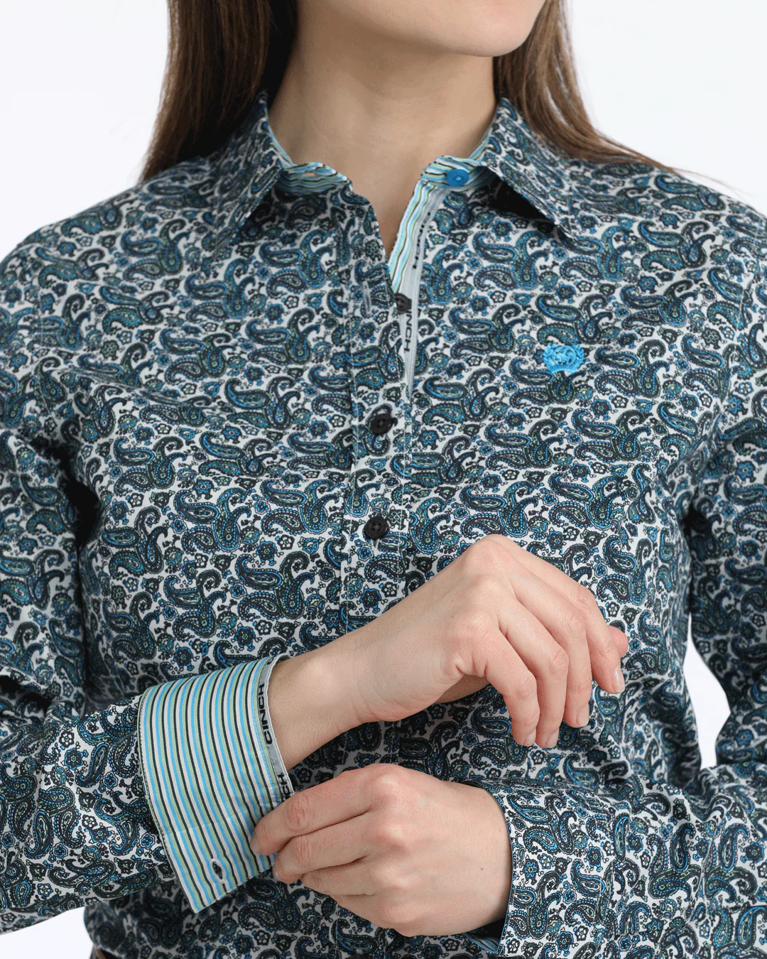 This blue printed cotton plain weave shirt delivers classic style with a modern edge. Designed with blue stripe contrast trim, a spread collar, an open left front pocket with embroidered CINCH logo, and navy blue buttons, it offers a polished look and comfortable fit that’s perfect for any day on the ranch or trip into town.